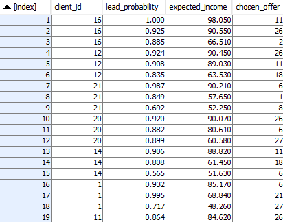 As a result, we obtain an output table with recommendations of the offers that will generate the highest revenue. For each of the client, there are 3 selected offers The limits for the campaign are maintained.