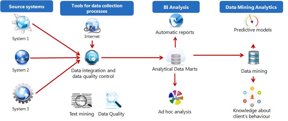 Information about provided services, customers and transactions can be stored in different database systems and data warehouses, depending on the way in which a company operates.
