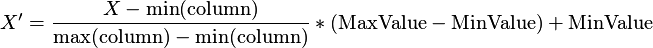 Normalizacja używana jest do transformacji tabeli wejściowej, w sposób że po transformacji, wartości dla zadanej kolumny są w przedziale <MinValue, MaxValue>. Normalizacja transformuje dane według następującej formuły: