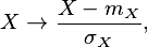 Standaryzacja oznacza odjęcie dla każdego wpisu w kolumnie (dla typów liczbowych) wartości średniej z wszystkich wpisów tej kolumny, następnie podzielenie wyniku przez odchylenie standardowe tej kolumny. Wartości null pozostaną niezmienione. Warunkiem koniecznym dla tej transformacji jest, aby odchylenie standardowe nie było zerem. Transformacja standaryzacji odbywa się na podstawie wzoru: