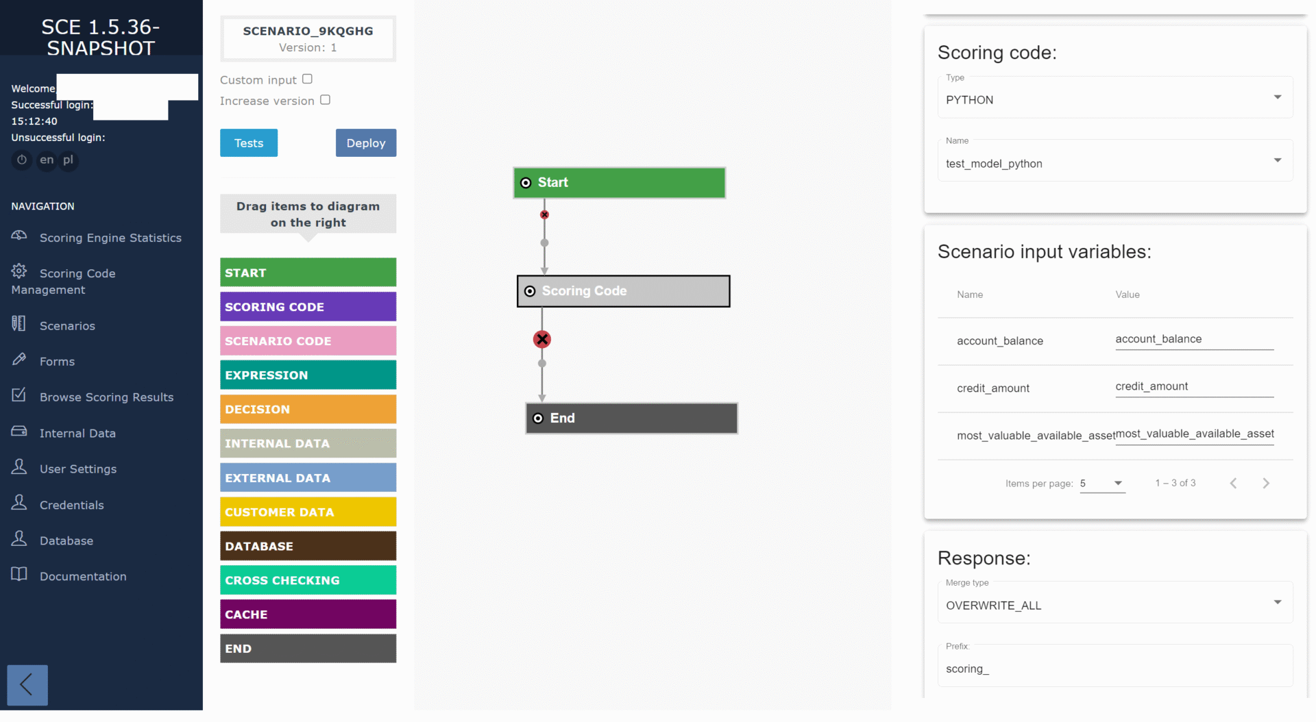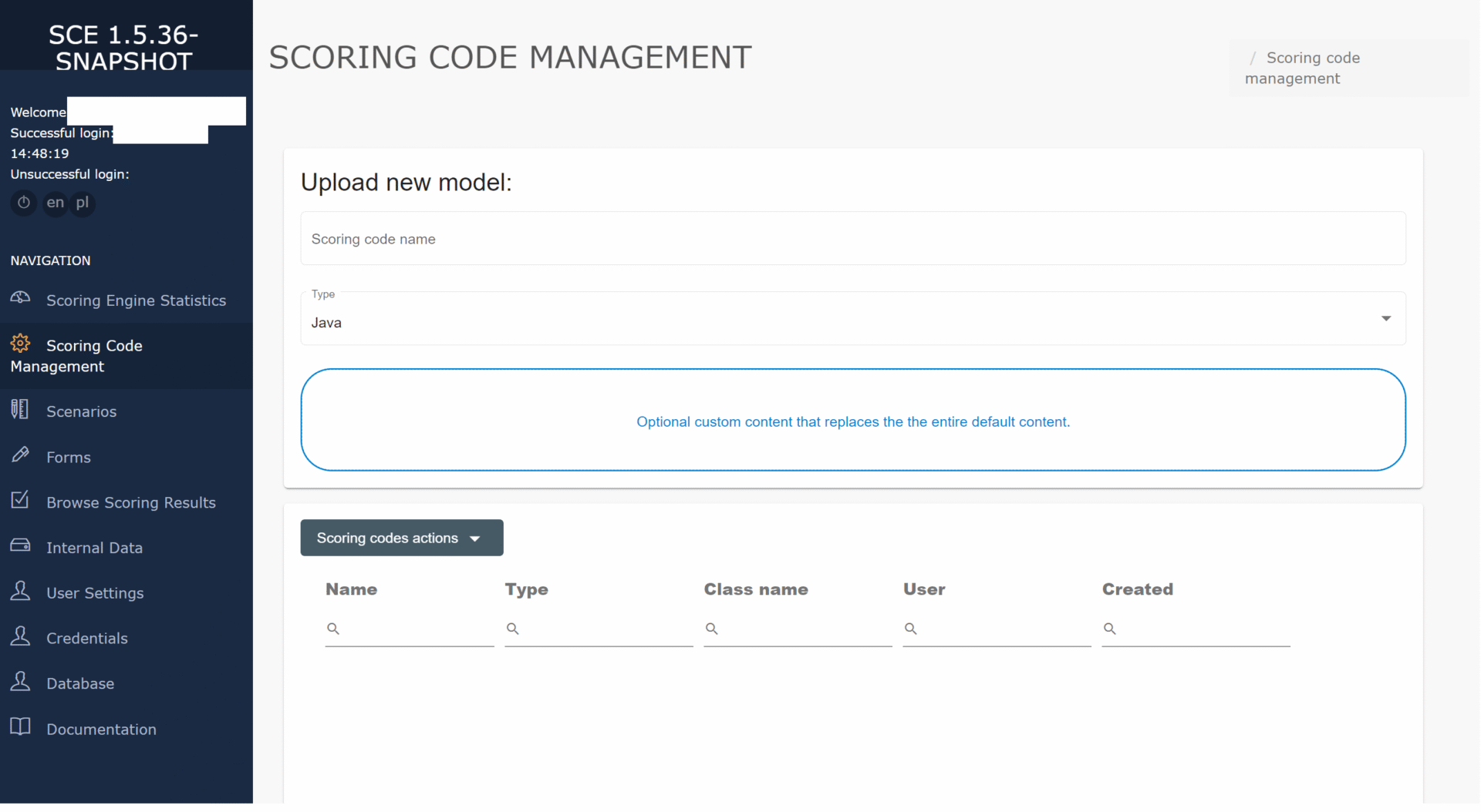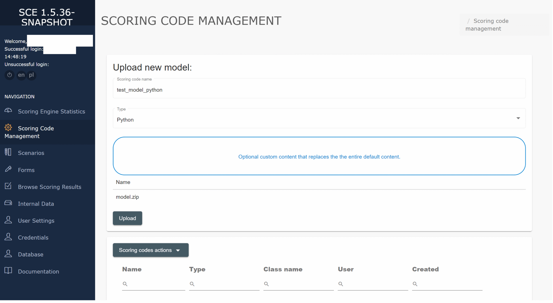 Wejdź w zakładkę „Scoring Code Management” i wybierz opcję dodania nowego kodu (Scoring codes actions -> Upload new model).