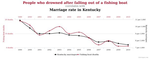 Liczba osób które poniosły śmierć przez wypadnięcie z łódki podczas wędkowania a liczba związków małżeńskich w stanie Kentucky.