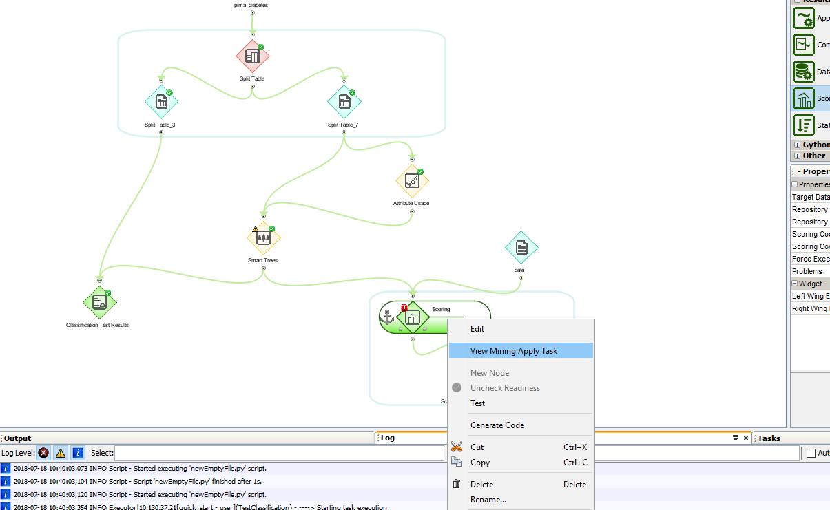 Aby przewidzieć wyniki używając swojego modelu dołącz do Workflow bazę danych, dla której chcesz przewidywać. Dołącz do niej kafelek Scoring, który musi być połączony z modelem.