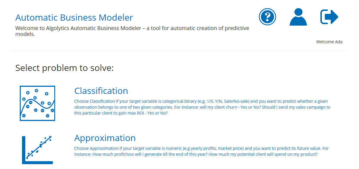 - Automatic Business Modeler (ABM) – narzędzie umożliwiające automatyczną budowę oraz aktualizowanie modeli predykcyjnych. Zapewnia pełną automatyzacje niezbędnych, ale czasochłonnych czynności, takich jak wybór zmiennych, transformacje, modelowanie interakcji czy dobranie najlepszego modelu.