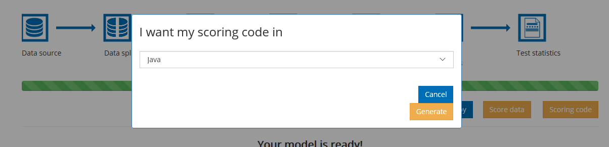 Jako dialect należy wpisać język, w jakim ma zostać wyeksportowany kod scoringowy: JAVA, SQL, SQL_MSSQL, SQL_TERADATA, SQL_ORACLE, SQL_POSTGRES.