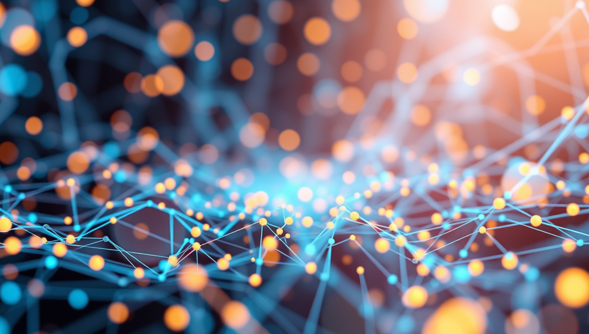 Algolytics - Abstract visualization of a network with blue lines and orange nodes on a dark background.
